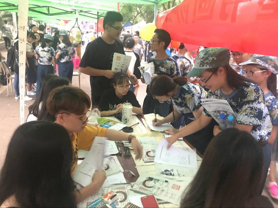 本通讯(通讯员:邓春瑛)随着军训的进行中,2017社团招新活动也于2017年9月22号正式开始,活动地点在外语楼前的主干道上,我们协会的摆点位置在26号。22号早上七点半,理事们就将招新所需要的物质搬到摆点处,布置好招新点,准备迎接学妹学弟们的到来。大家都充分调用自己的课余时间,积极配合协会的招新安排,为协会招新做出自己的贡献。