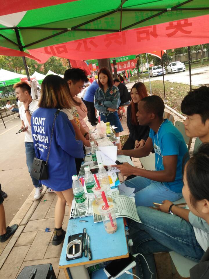 萌新们在操场上军训着,部长们则做着招新前最后的准备。军训停,原本略显冷清的帐篷前立马围满了人。面对一张张略显激动稍带紧张的小脸庞,部长们皆报以浅浅的微笑,而对于各式各样千奇百怪的问题,部长们也心平气和,不厌其烦地为每一位小萌新答疑解惑。为时两天的招新有条不紊地进行着,期间还有外国留学生前往招新地点,为英俱打call。招新过程相当和谐,有欢声笑语,也有为能锻炼自己英语能力而信心十足道“我一定要进口语部!”的声音。