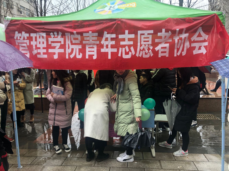 淅淅沥沥的小雨,纵有微凉,但是却没有影响志愿者们对学习雷锋义务活动的热情。一大早志愿者们就忙着摆点的相关事宜,准备工作有序进行,采用线上线下两种形式来宣传本次活动,让更多大学生了解并加深对志愿者精神——“奉献,友爱,互助,进步”的理解。