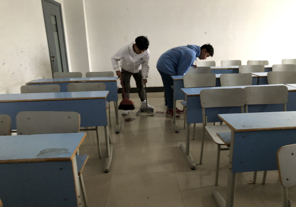 (图为新生正在打扫卫生)