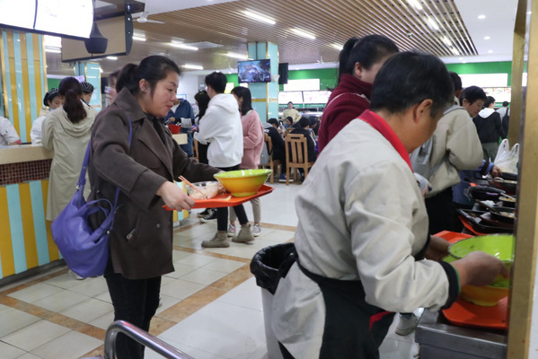 2019年11月22日中午12点整,我校青年志愿者协会的值班人员已经全部在一食堂、二食堂值班地点就位。在“绿色食堂”的工作中,校青年志愿者协会采取分时间段值班制。在就餐高峰期的时间段,志愿者在各食堂站岗值班,严禁食堂吸烟、引导同学们有秩序的排队买饭并在就餐后主动把餐具放回回收车。在我们的采访报道中,能观察到大部分同学都能有序的排队就餐,并主动回收餐具。