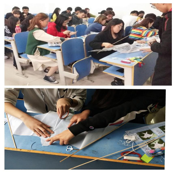 课程刚开始,主讲人殷可意以及世界语和英语俱乐部的同学们,都依次向留学生朋友们简单的介绍了一下自己,相互认识。她带着我们一起了解风筝的起源,历程和风筝文化。即使有些留学生的中文不那么好,可能不能完全听懂,但是他们也都在全神贯注的听着。然后中国的学生就开始教留学生们如何做风筝,留学生们都在认真的听中国学生讲着,参照他们的做法进行操作,他们一起合作完成。制作过程中有说有笑,相处十分融洽