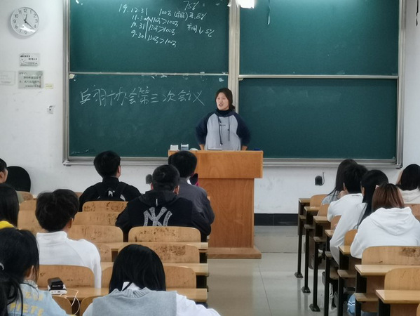 乒羽协会是一个以运动为主的协会,其主要目的在于如何让乒乓球与羽毛球这两项运动在学校发展的更好。其中乒乓球与羽毛球两大中心部门的部长分别上台讲述关于场地与会员参与数的问题。