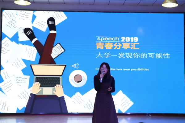 (图为文法学院毕柔带来演讲《大学发现你的可能性》)
