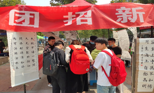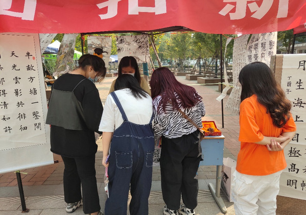 在摆点期间,我们展览了优秀的书画作品,吸引了众多新生驻足观看;并且还准备了由教学部书写的精美书签,引起了无数新生对协会的好奇和兴趣。在摆点的场地上,摆点宣传活动热火朝天,展现着新生独有的蓬勃朝气。