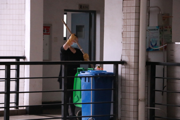 绿色教室的维护同样离不开保洁阿姨的辛劳付出,她们在七点以前到岗工作,主要负责走廊、洗手间、楼梯转角的卫生。