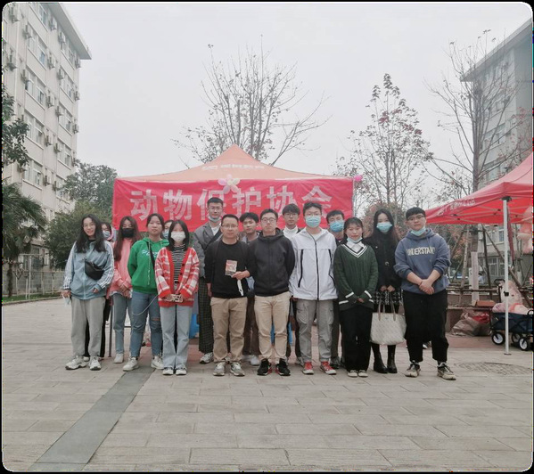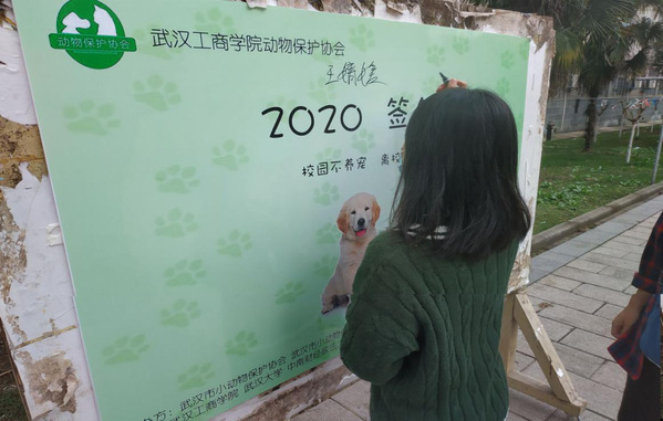会长和协会的成员们早早就为今天的活动做好了准备,随着会长在展板上签下第一个名字,校园不养宠宣传日正式开始了!