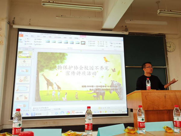 于中午12点30分,在综合楼的407教室,宣传校园不养宠的讲座正式召开,本次讲座有幸邀请到了武汉市小动物保护协会的会长杜帆杜会长来演讲。