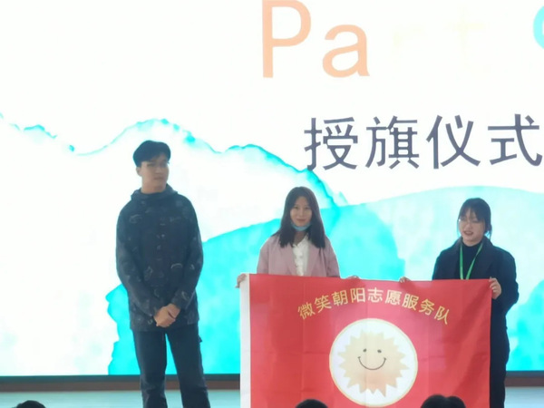 (图为严书格学长为微笑朝阳志愿服务队授旗)