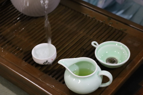 随后,社长邀请一名社员给其他社员们演示茶礼和制茶过程。社长根据这名社员的展示大致了解大家的所学的成效,并当场指导社员在展示过程中所反映的问题及时更正,从而加深了社员们对茶艺流程的整体印象。