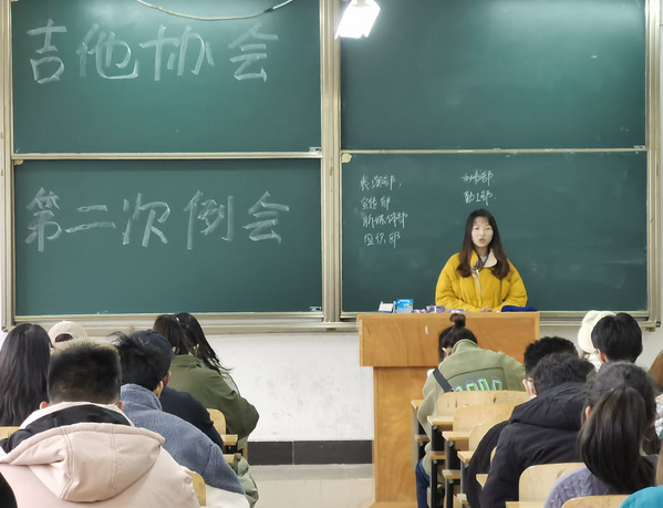 会长薛江缘在例会开始初,告诉了我们这振奋人心的好消息,解释了晚会的注意事项及大致流程,为我们梳理了大致的框架,为元旦晚会的圆满结束打下了优质的先决条件,引导我们能够更好更有效率的进行工作。伟大战役的胜利离不开领导者的正确指挥,薛会长用简洁的话语,干练的姿态为我们树立了优秀的榜样,相信这一次的活动依旧可以圆满结束,向武汉工商的同学们展现吉他协会的干练精神,展现吉他协会的风采。