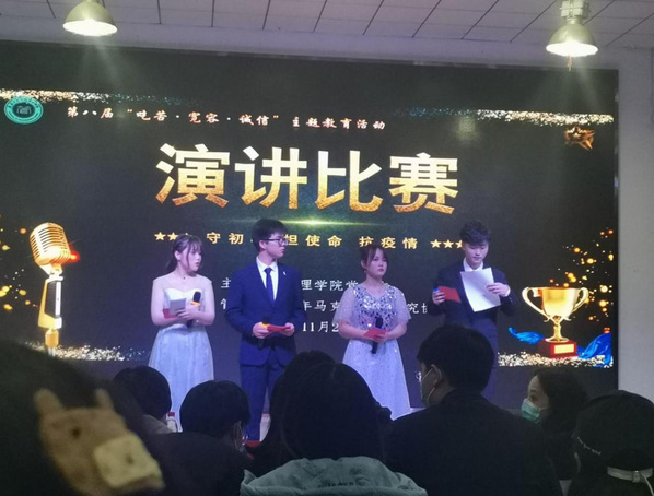 校马研讯(记者:李梦迪 摄影:李梦迪)2020年11月24日第八届“吃苦·耐劳·诚信”主题思想教育活动之“守初心、担使命、抗疫情”演讲比赛决赛在体育馆403圆满完成。此次演讲比赛,旨在学习抗疫一线工作者的艰苦奋斗的精神,提升我校同学的责任意识,增强我校学生的思想道德修养。本次活动由管理学院党总支主办,管理学院青年马克思主义研究协会承办。到场人员由分团委书记张力、辅导员、教师代表以及各协会负责人作为嘉宾出席了本次活动并担任评委。