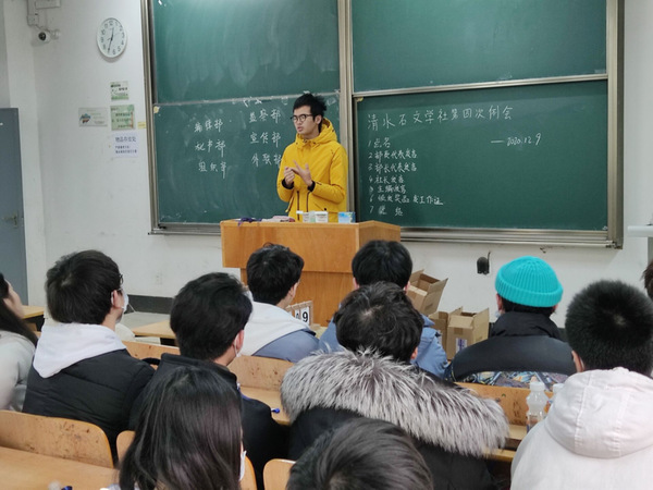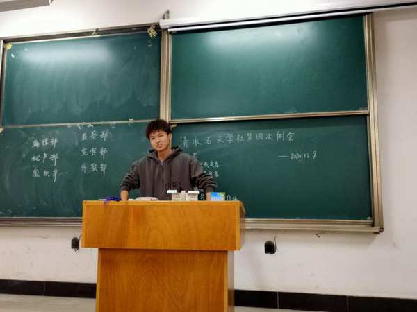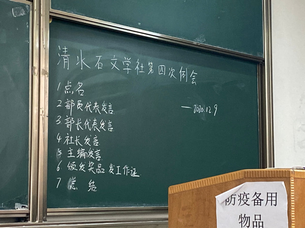 2020年12月9日星期三中午12点10分,清水石文学社于综合楼311教室召开了本学期的第四次例会,也是最后一次例会。本次例会的参与人员有社长、部长以及各社员。本次例会的目的是反思社团在本学期内出现的问题,同时也总结取得的突出成就,并给表现优秀的部员进行奖励。