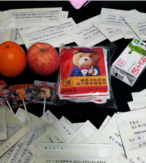 书记陈玲、辅导员王梦珂以及一些20级新生代表们每人手里拿着给考研生的慰问礼品,分别前往八栋女寝、九栋男寝敲了每一位考研生的寝室门,亲自把学弟学妹们写给考研生们的“爱”的小卡片交给了考研生们,并且给他们们送上了暖宝宝贴、水果、牛奶、糖果等一些小礼品,并深切地问候考研生们。