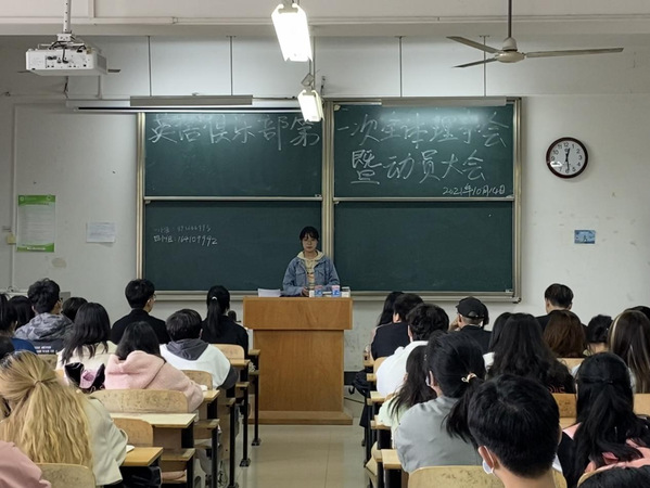 英语俱乐部讯(记者:许心怡 夏晨曦 拍摄:许心怡 夏晨曦)2021年10月14日中午12:10分,英语俱乐部于bat365登录平台入口综合楼402为全体理事举行第一次例会暨动员大会,本次例会由秘书部部长胡苗主持。会长,副会及各部门部长出席了此次会议。