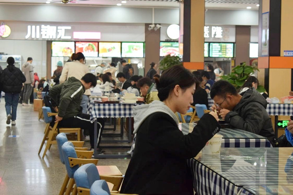 据值班同学说同学们就餐相对于之前文明了一些,没有大声喧哗和插队等现象。大家都自觉排队,不吵闹也不拥挤。吃完饭后会将餐具和吃不完的饭放到对应的回收桶里面,给打扫食堂的阿姨也带来了很多便利。采访完值班同学后记者又随机选择了一名就餐同学进行了采访,据同学反映食堂卫生状况比以前好很多。同学们就餐后也会习惯的将餐具带走放到指定位置,但偶尔也会有吵闹和插队的现象。食堂环境需要大家一起守护,努力营造更好的就餐环境,节约粮食、拒绝浪费,方便他人更是方便自己。随后记者跟随值班同学进行巡查,大家都非常自觉的排队买饭,带走餐盒,但也有部分同学忘记带走餐盒、吃饭嬉闹,经过提醒也非常积极配合值班同学和食堂阿姨的工作。