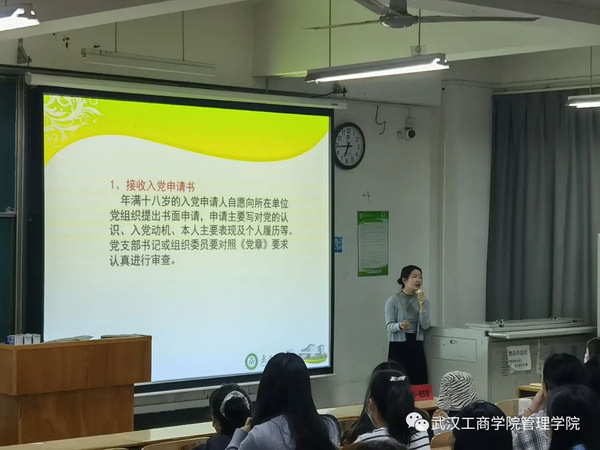 随后,程老师又介绍到成为发展对象的流程:只有经过一年以上培养教育和考察、基本具备条件的入党积极分子,在听取党小组、培养联系人、党员和群众意见的基础上,支部委员会讨论同意并报备上级党委备案后,才可列为发展对象。随后还要对发展对象进行公示和备案,集中培训和政治审查后向校党委送审有关材料,发放《中国共产党入党志愿书》。