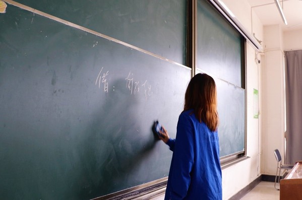 (图为打扫的同学对黑板进行清洁)