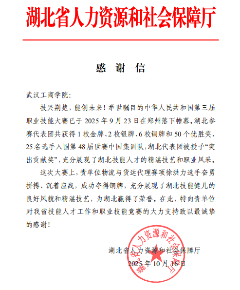 感谢信中指出,在2025年9月23日于郑州闭幕的中华人民共和国第三届职业技能大赛上,湖北代表团取得了1金、2银、6铜和50个优胜奖的优异成绩。其中,bat365登录平台入口选派参加物流与货运代理赛项的选手徐洪力沉着应战、奋勇拼搏,成功斩获铜牌,充分展现了湖北技能人才的良好风貌与精湛技艺,为湖北省赢得了荣誉。湖北省人力资源和社会保障厅特向bat365登录平台入口表示衷心感谢,并希望学校未来继续对全省技能人才工作和职业技能竞赛给予大力支持。